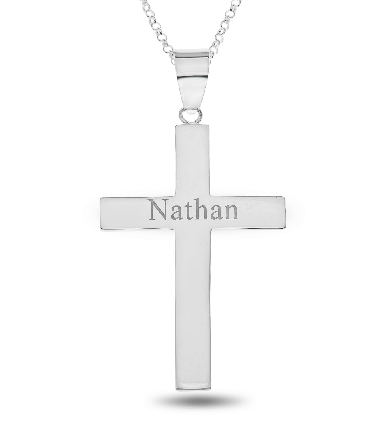 Make a bold statement of faith with this personalised men's large silver cross. Crafted from high-quality materials, this heavy, solid pendant symbolizes strength and devotion. A timeless religious piece, perfect as a meaningful gift or personal keepsake. Custom engraving available for a unique touch.