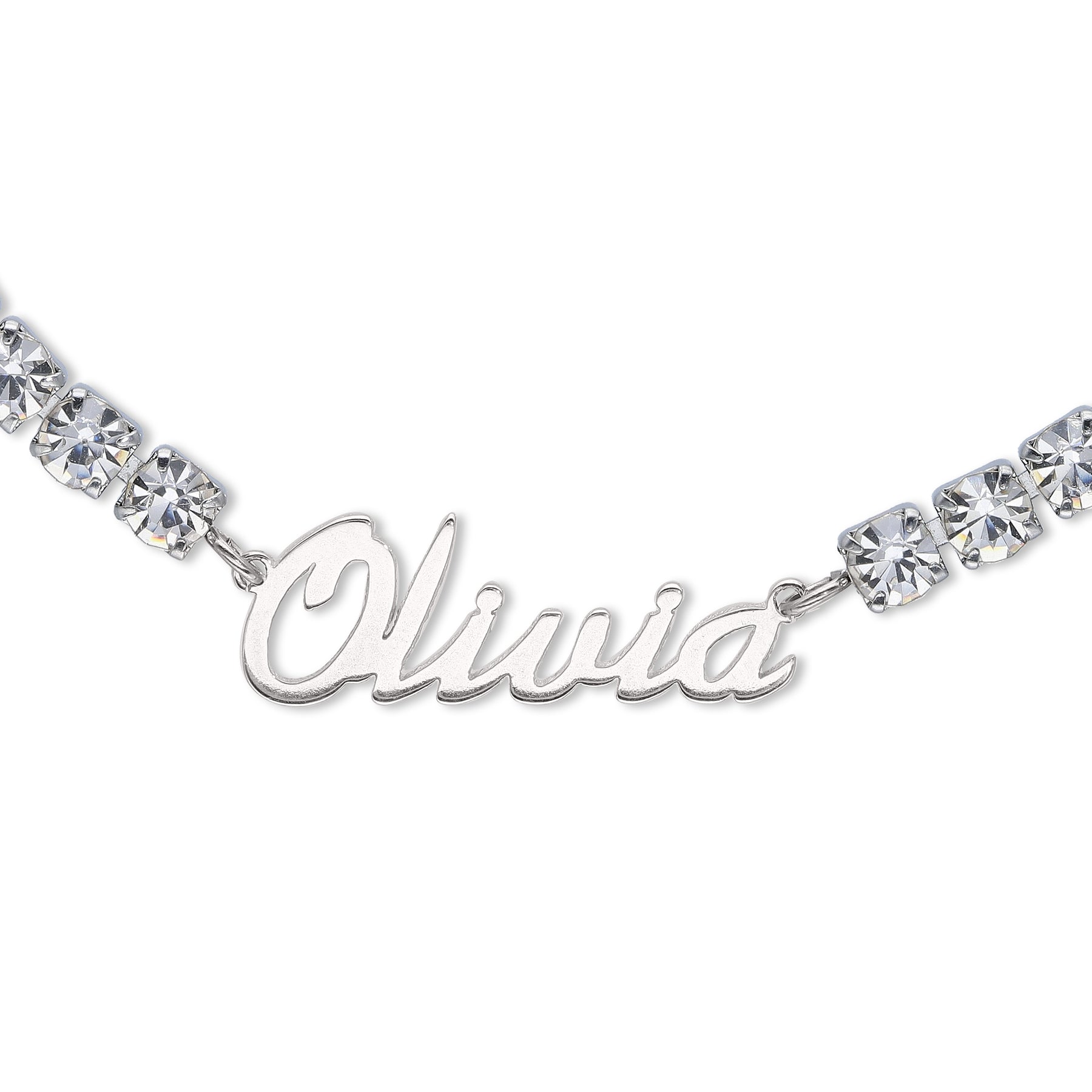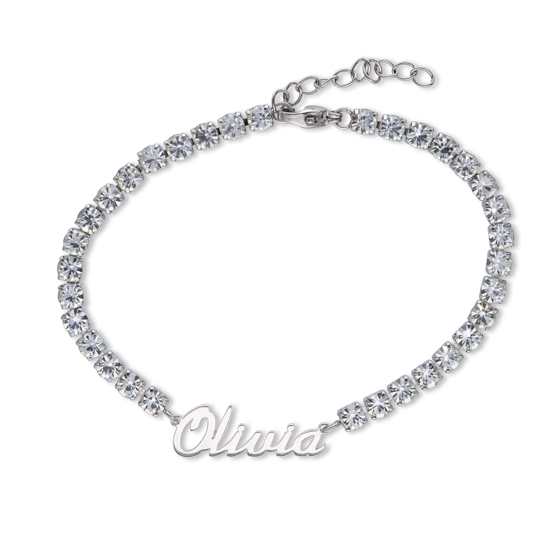 This elegant tennis bracelet features sparkling zirconia stones set in durable stainless steel, offering both shine and strength. The centrepiece is a beautifully crafted sterling silver nameplate, custom engraved with your chosen name – making it a timeless, personal accessory perfect for everyday wear or special occasions.